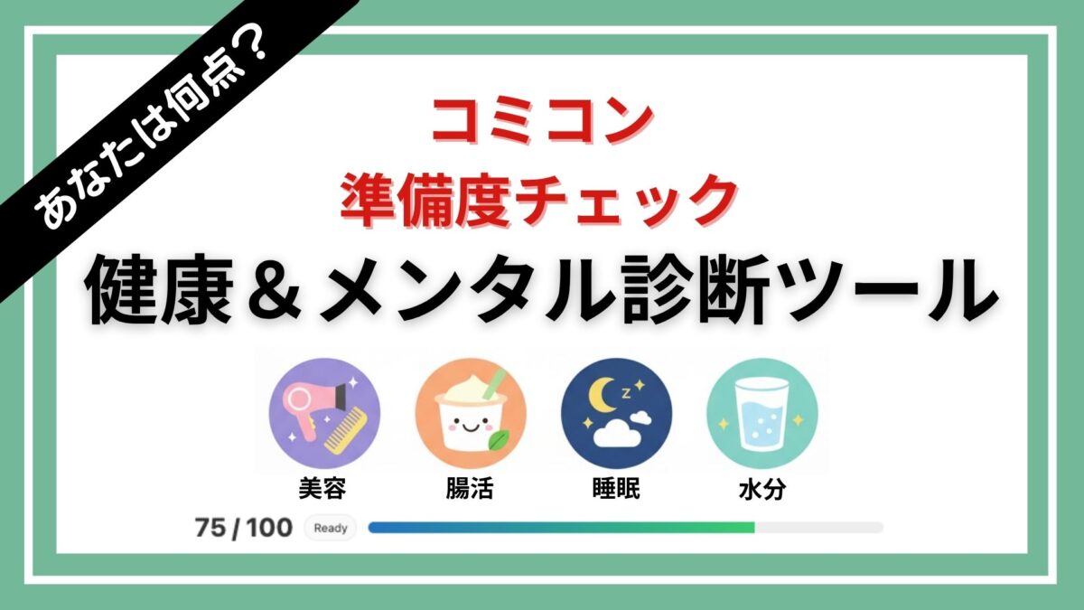 コミコン前1か月の準備度を判定|健康&メンタル診断ツール コミコン 2025.11.09 スポンサーリンク 目次 イベント準備度 診断 所要1分11問でセルフチェック結果仕上げのための最短チェック関連動画 イベント準備度 診断 所要1分 当日を最高に楽しむために、1か月前〜当日までの整え度合いを点数化します。体調・集中・安心感の3軸で評価します。 11問でセルフチェック 美容準備(美容院/ネイル/眉サロン等) 2週間前〜前日 身だしなみを整えると自信が高まり、イベントをよりポジティブに楽しめます。 なぜ重要?髪・爪・肌などのメンテナンスは、外見だけでなく気持ちのスイッチにもなります。 未着手:まだ予約していない 実践中:どれか1つだけ予約済み 定着:必要なケアをすべて完了 腸活(ヨーグルト/発酵食品) 調整期:4〜2週間前 消化が穏やかだと体のリズムが安定し、長時間の移動や待ち時間にも対応しやすくなります。 なぜ重要?腸内バランスが整うと、日中のエネルギー感や気分が安定。コンディション管理の基礎づくりになります。 未着手:気が向いた時だけ 実践中:週3〜5回を継続中 定着:毎日1回以上を2週間継続 水分リズム(朝昼しっかり/夕方以降控えめ) 調整期:3〜1週間前 一定の水分ペースは体調の波を小さくし、パフォーマンスを安定させます。 なぜ重要?日次の水分習慣を整えると、むくみやだるさを感じにくくなり、当日の集中力やコンディションに影響します。 未着手:日によってバラバラ 実践中:夕方以降はやや控える習慣 定着:朝昼多めの習慣が2週間以上 睡眠スケジュール(±30分以内) 全期間 起床時間が一定だと自律神経の切替がスムーズになり、当日もベストに近い状態で動けます。 なぜ重要?体内時計が安定すると、日中の覚醒度が上がり、移動・待機・交流のどれにも集中しやすくなります。 未着手:寝起きが日々ズレる 実践中:起床だけは固定し始めた 定着:就寝/起床とも±30分を1週間キープ 軽運動(脚中心:歩行/スクワット) 3〜1週間前 下半身の習慣は血行と体温の安定に役立ち、長時間の立ち時間でも疲れにくくなります。 なぜ重要?ふくらはぎと股関節を動かすと、巡りがよくなり、全体のスタミナと姿勢が維持しやすくなります。 未着手:週1以下 実践中:週2〜3、各10分以上 定着:週3以上、各15分以上 免疫ケア(ビタミンC/手洗い/人混み対策 など) 2週間前〜 小さな不調を避けるほど、当日の楽しさと集中が保ちやすくなります。 なぜ重要?軽い不調でも体力と注意を消費します。日々のケアが当日のパフォーマンスを底上げ。 未着手:特に意識していない 実践中:どれか1つは継続 定着:1つ以上を無理なく継続 装備の棚卸し(電源/薬/予備マスク/傘 など) 1週間前 備えがあると安心感が増し、当日の行動に集中できます。 なぜ重要?「準備できている」という感覚は迷いを減らし、楽しさに意識を向けやすくします。 未着手:当日朝に考える予定 実践中:必要品をメモで整理 定着:準備完了 会場動線・休憩スポットの把握 1週間前〜前日 行程が見えていると落ち着いて行動でき、予定変更にも柔軟に対応できます。 なぜ重要?アクセス・入口・休憩場所を事前に把握しておくと、当日の判断が速くなり、ストレスが減ります。 未着手:当日なんとかする 実践中:アクセス/入口は把握 定着:メモや地図アプリに保存 チケット/予算シミュレーション 1〜2週間前 金額の見通しがあると不安が減り、当日の選択に迷いがなくなります。 なぜ重要?総額を可視化すると優先順位が明確になり、満足度の高い体験に繋がります。 未着手:ざっくりしか把握していない 実践中:主要分だけ試算した 定着:全項目を見積り→優先順位決定 前日ルーティン(入浴→スマホ断ち→就寝) 前日 同じ手順はスイッチとなり、落ち着いて眠りやすくなります。 なぜ重要?睡眠の質が上がると、翌日の集中力・回復力・機嫌が良い状態になります。 未着手:特に決めていない 実践中:どれか1つは守る 定着:3つ全てを実行予定 当日の“仕上げ”アイテム(口に含む/香り/温感など) 当日 口に含むもの・香り・手触り・温かさなど、感覚の切り替えで気分と集中を整えます。 なぜ重要?小さなルーティンやアイテムがあると、気持ちのメリハリがつき、当日のパフォーマンスが安定します。例:飴/ガム、アロマ/香水、リップ、カイロ、ハンドクリームなど。 未着手:まだ用意していない 実践中:どれか1つは用意済み 定着:自分の“スイッチ”を複数用意している 診断する リセット 結果 0 / 100 – 仕上げのための最短チェック ※このフォームはブラウザ内でのみ動作し、データの保存や送信は行いません。 関連動画
