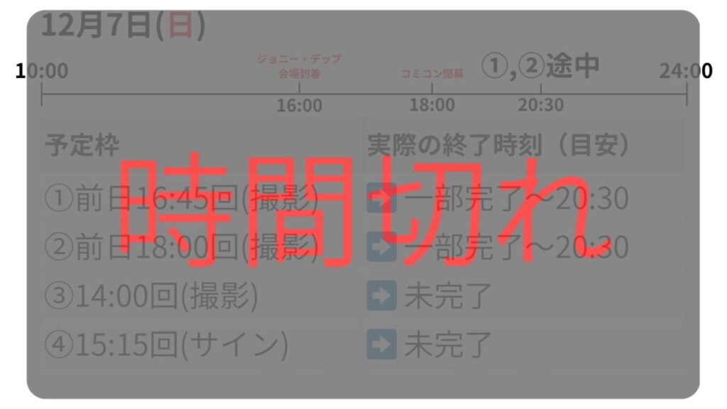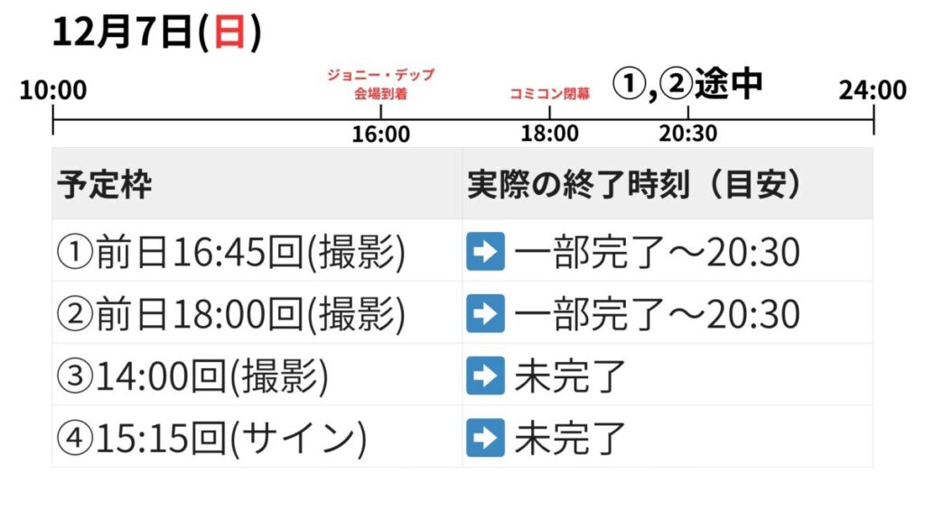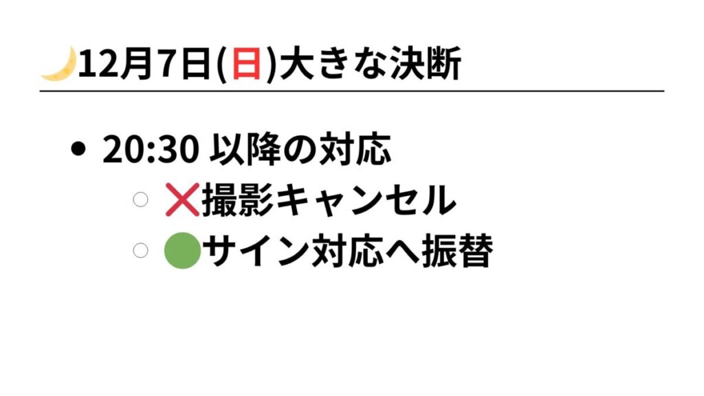 - ① スケジュールのズレ(初日2時間遅延 → 深夜まで影響)