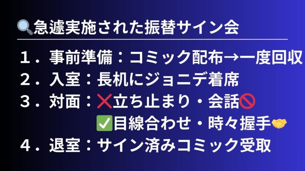 A. コミック配布→回収→高速サイン→返却という、数十秒単位の進行だったようです。